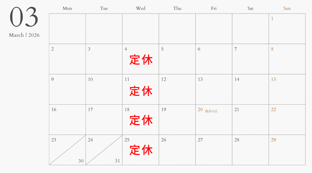 3月からは通常通りの水曜日が定休日になっていますのでお気を付けください👐