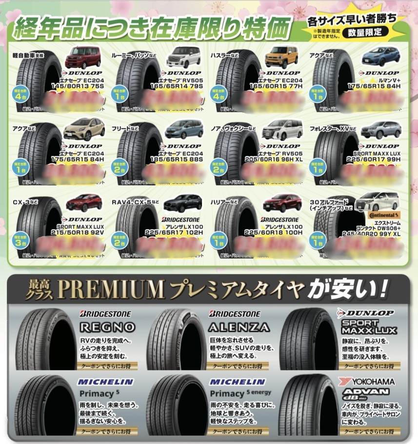 お買得なノーマルタイヤ、スタッドレスタイヤを