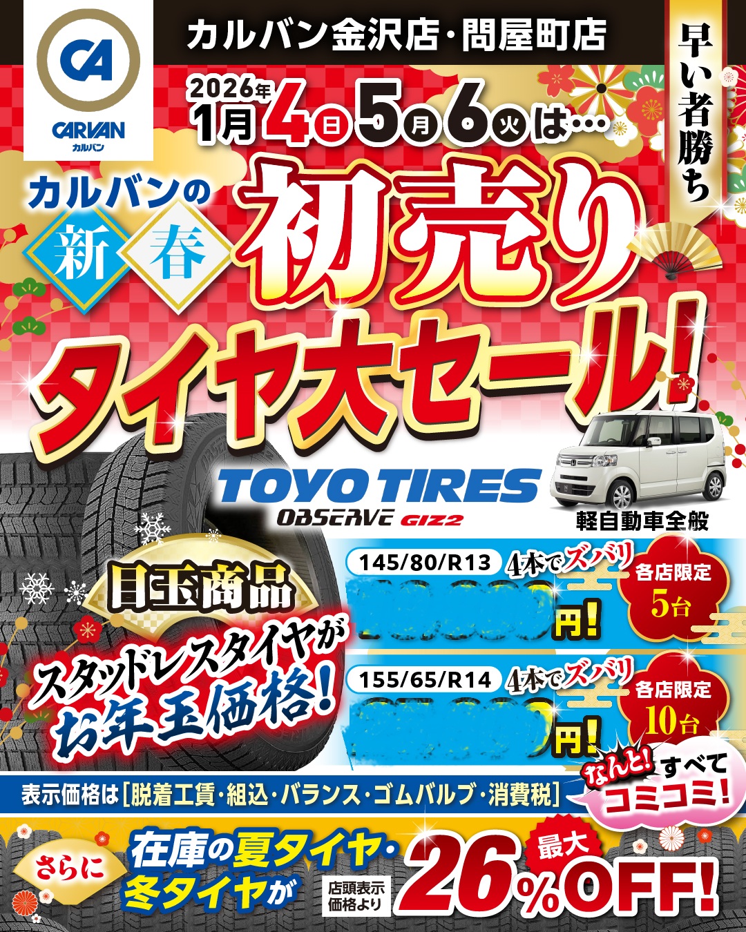 2025.12.21 4WD/SUV お知らせ イベント告知 スタッフ紹介 ミニ知識 商品紹介 施工事例 新春初売り2026年 こんにちはカルバン金沢店です🌈 2026年 新春初売り🎍 タイヤ大セール開催🎉 2026年のスタートはお得なタイヤ交換から始めませんか? 新年最初のビッグチャンスとして期間限定・数量限定でタイヤを特別価格にてご提供いたします😌🎵 ※数量限定の為なくなり次第終了となります※早い者勝ちとなりますのでお早めにご来店ください 年内は、🎅ホイールクリスマスフェア🎅 開催中でーす!! 12月27日(土)まで😌 PREV 一覧に戻る NEXT