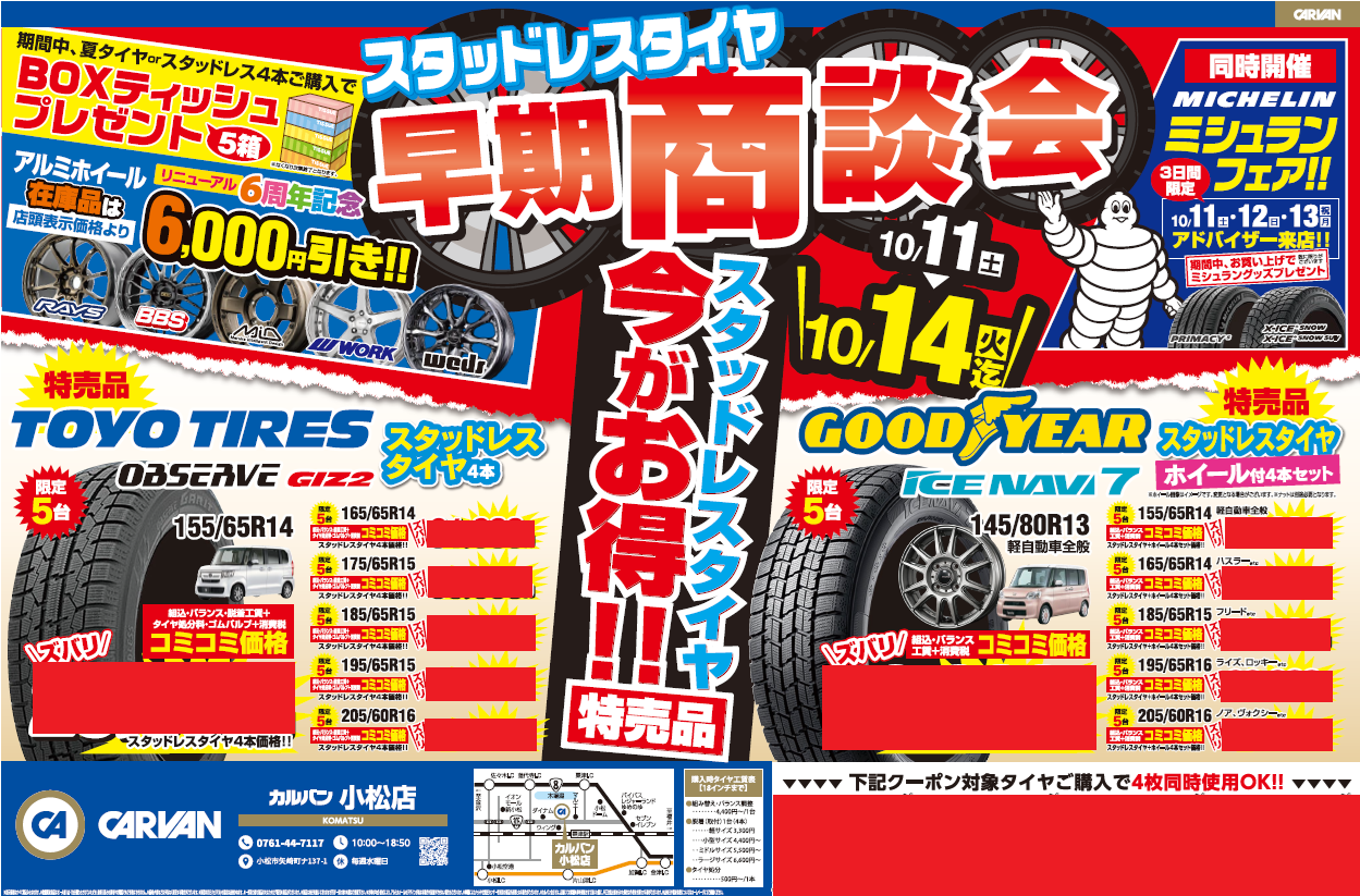 10/11(土)~14(火)までブリヂストン×ミシュランのスタッドレスタイヤフェアを開催いたします😆❗
