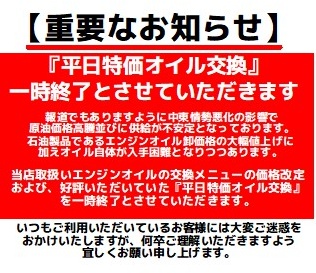 『平日限定特価オイル交換メニュー』の一時休止