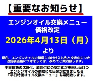 ◆エンジンオイル交換メニューの価格改定