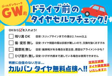 カルバン長岡店ではドライブ前のタイヤ無料点検実施中!