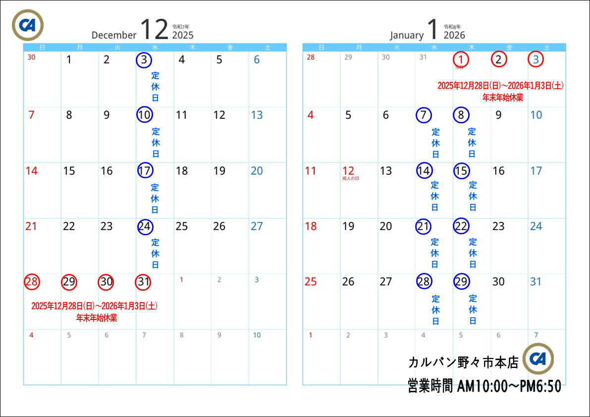 2025.12.15 野々市本店からのお知らせ 【年末年始のお休みについて】 こんにちは!カルバン野々市本店です 今年の年末年始のお休みとなります! また、1月ですが水曜日の定休日以外にも毎週木曜日もお休みとなりますので ご来店の際はご注意ください🙂↕️ PREV 一覧に戻る NEXT