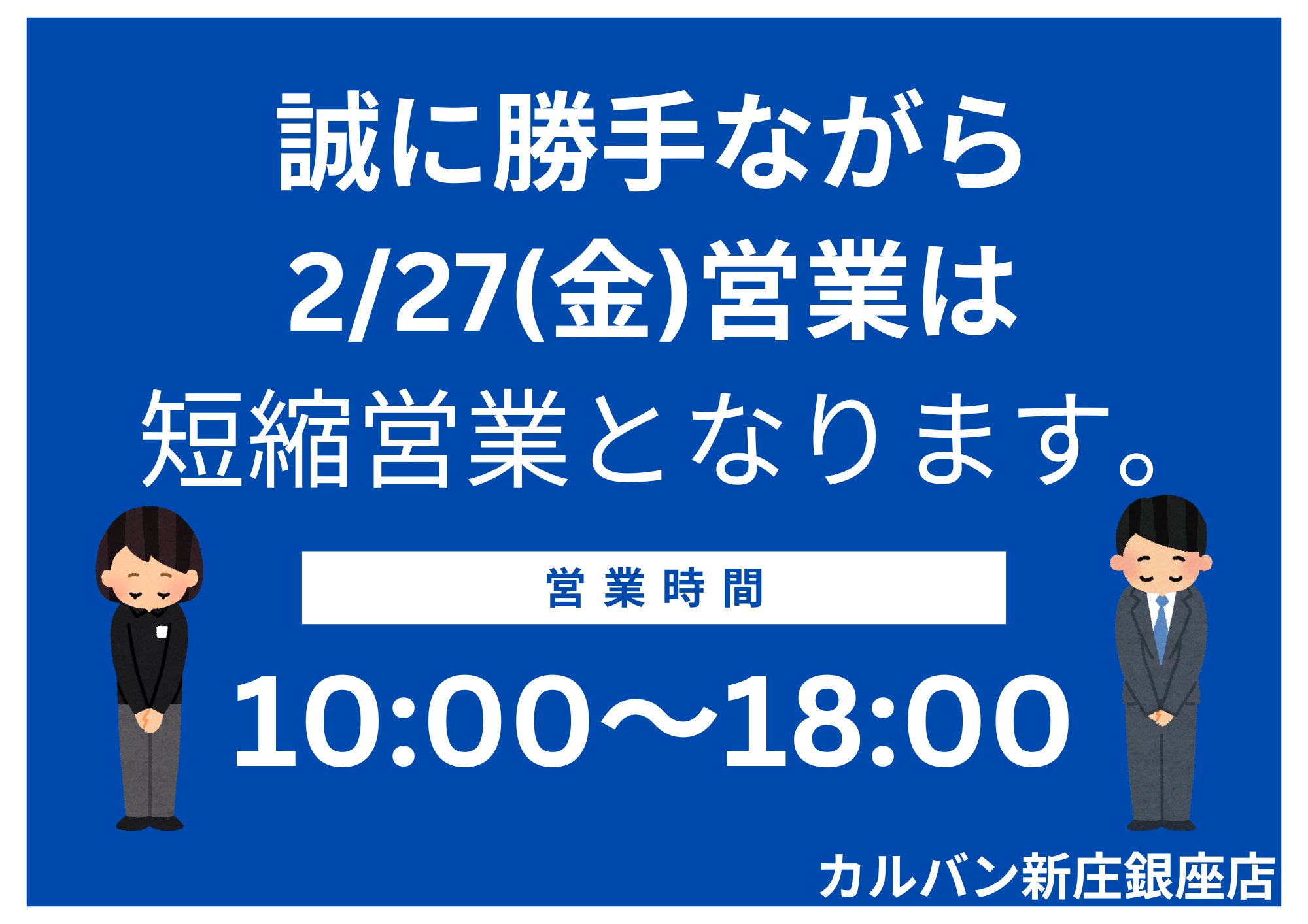 2026.02.23 お知らせ 2/27(金)営業短縮のご案内 誠に勝手ながら2/27(金)の営業は短縮営業とさせていただきます。 詳しくは下記画像をご確認下さい。 ご迷惑をおかけしますがご理解の程よろしくお願いいたします。 PREV 一覧に戻る NEXT