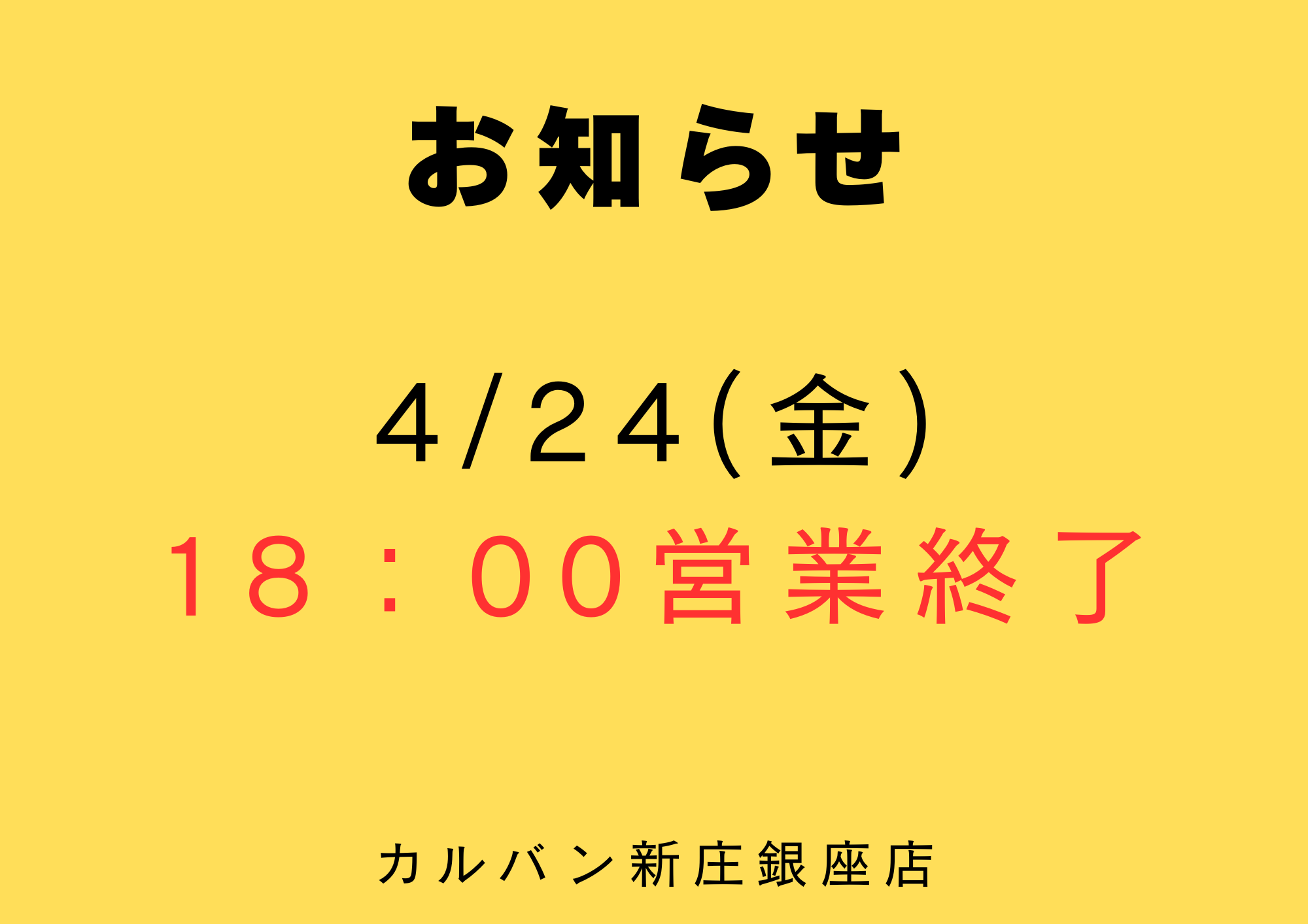 2026.04.21 お知らせ 4/24(金)営業時間変更のお知らせ 4/24(金)は社内研修の為 18時で営業終了させていただきます ご迷惑をおかけしますが ご理解のほどよろしくお願いいたします。 PREV 一覧に戻る NEXT