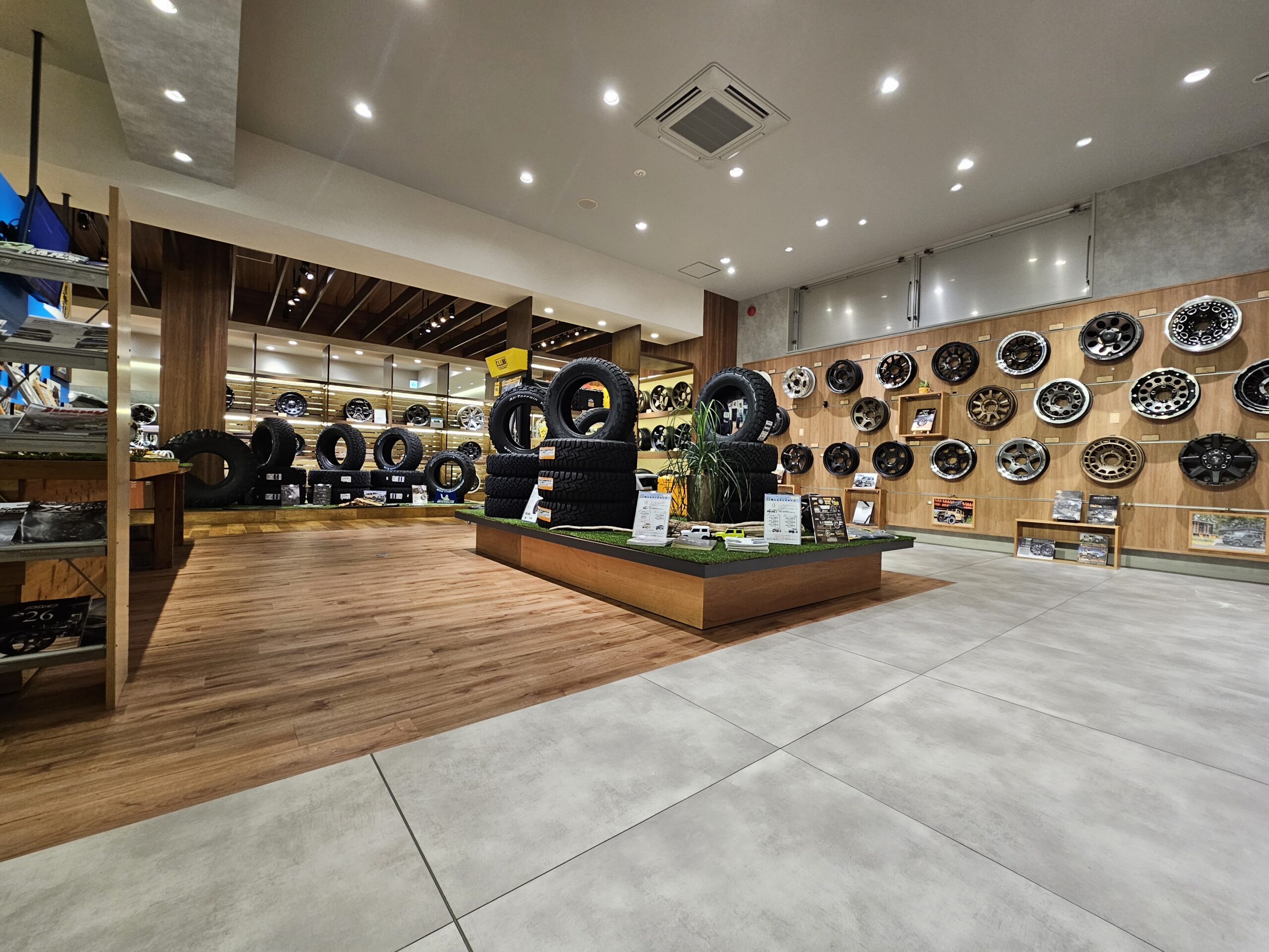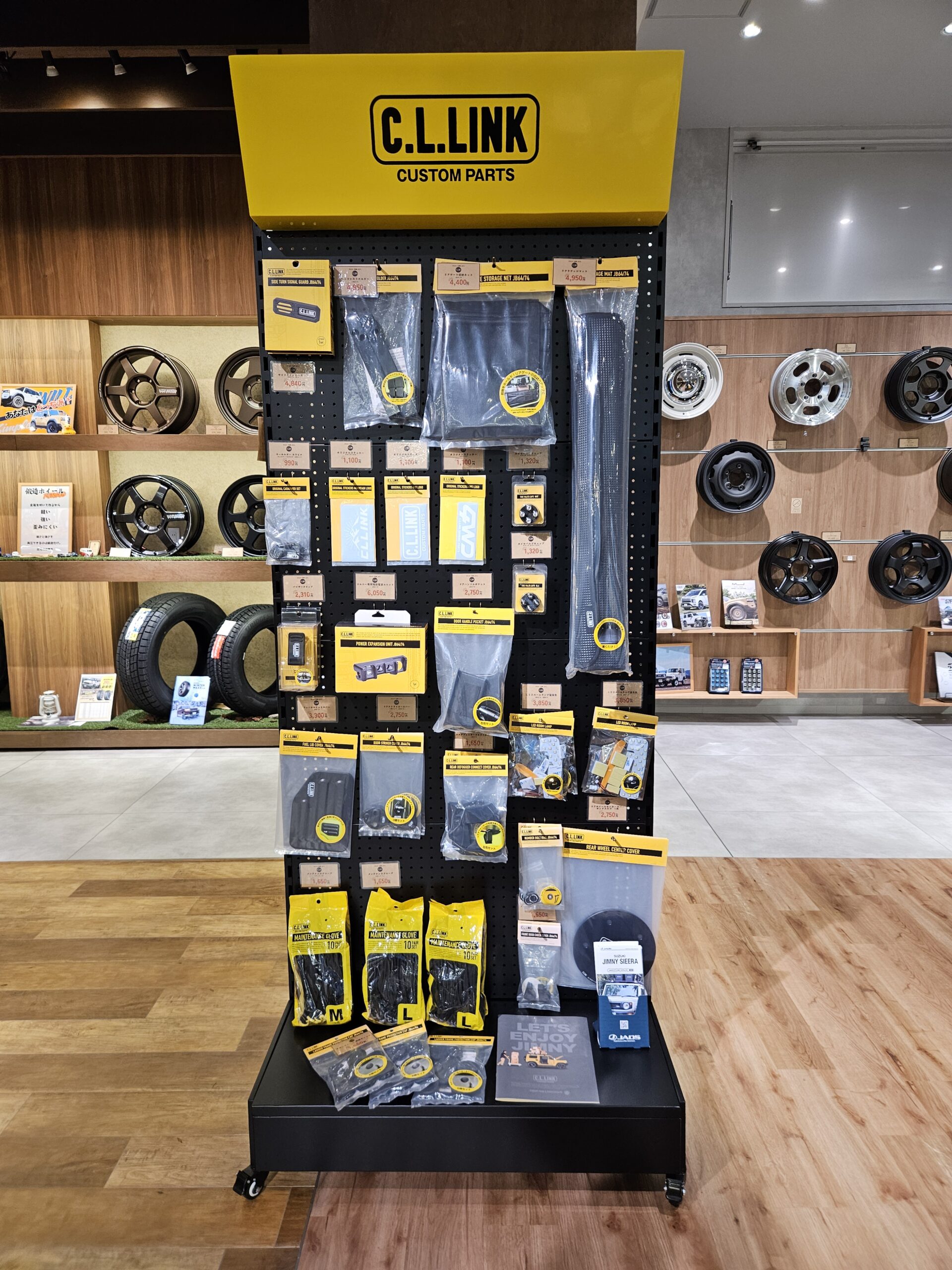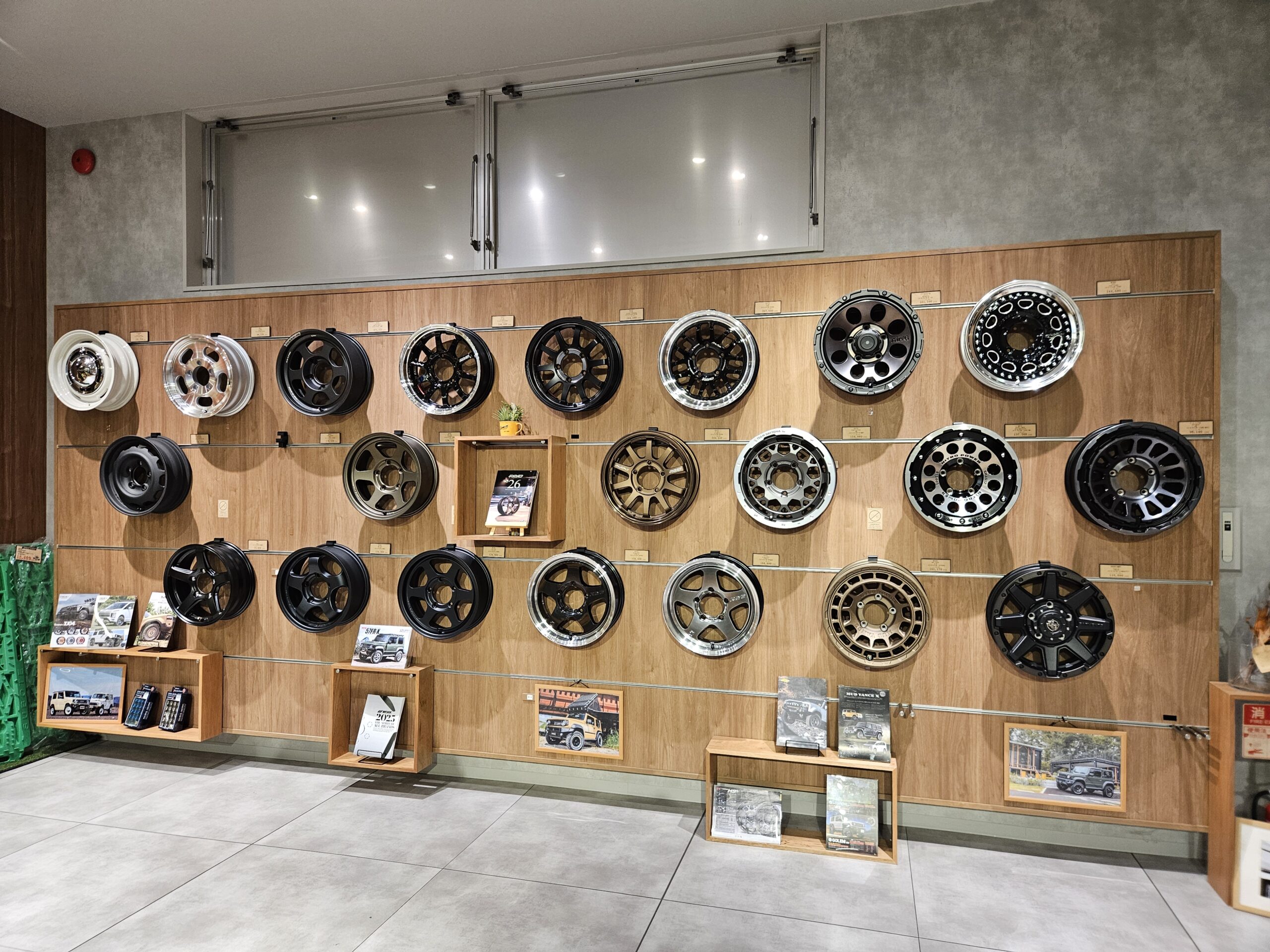 壁一面をジムニー&シエラ、ノマド専用サイズのホイールを展示&在庫しています。