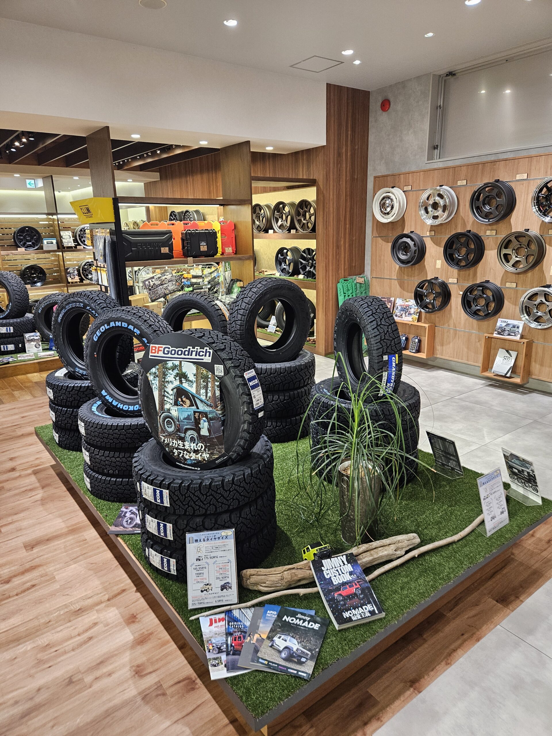 壁一面をジムニー&シエラ、ノマド専用サイズのホイールを展示&在庫しています。
